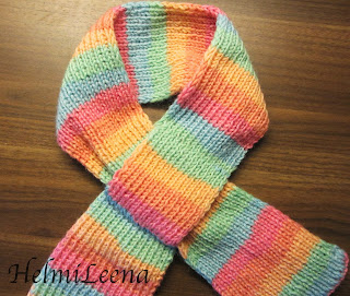 | Tehty 3-vuotiaalle tytölle. Ideana on että huivin pää menee vastakkaisen pään läpi eli ei tarvitse solmia. |