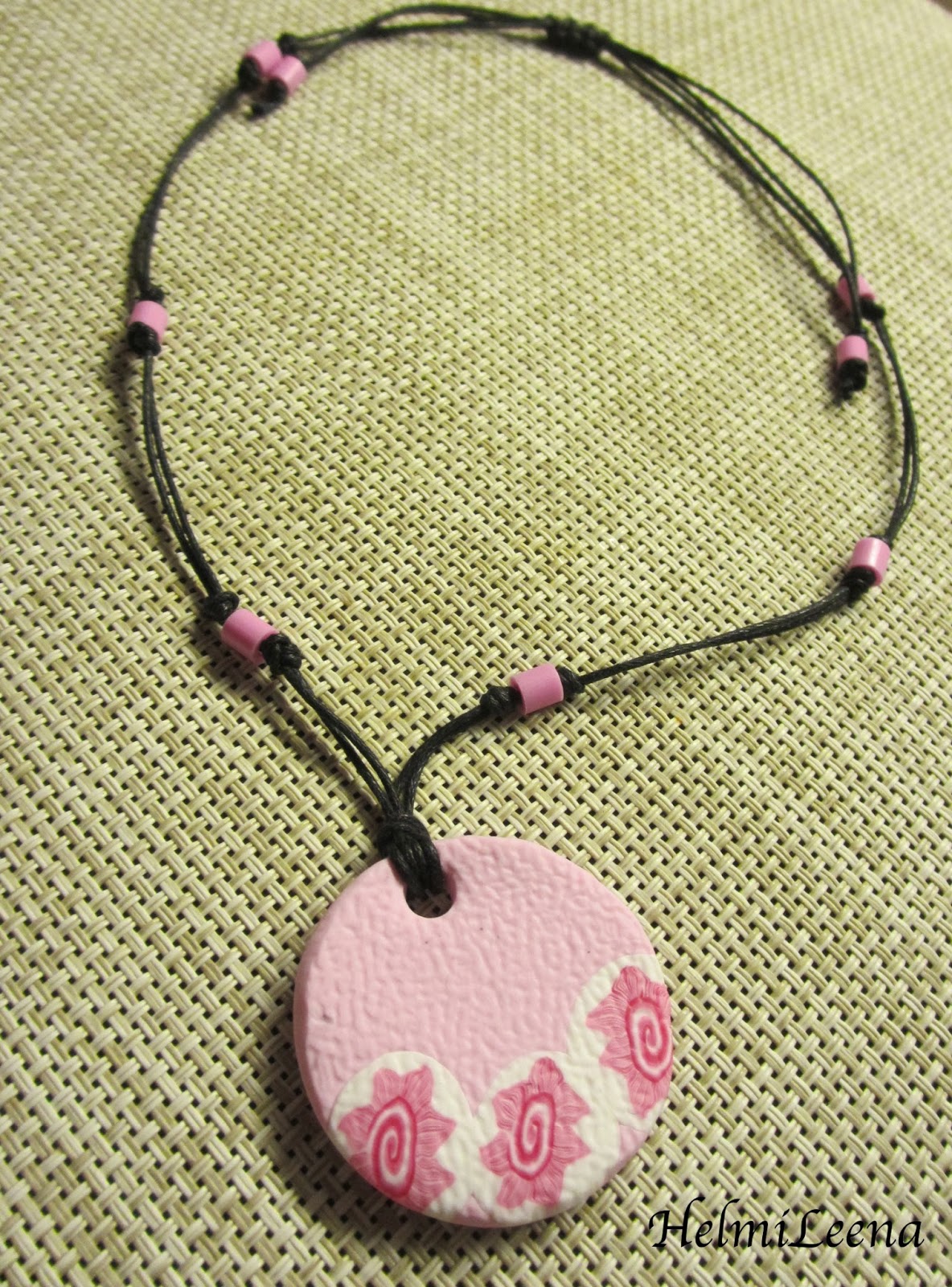 Pujotettu puuvillanauhaan pinkkien hamahelmien kera.