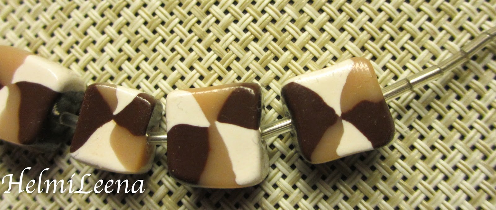 Massasta tehtyjä laattahelmiä yhdistetty hopeoidulla ohuella langalla.
