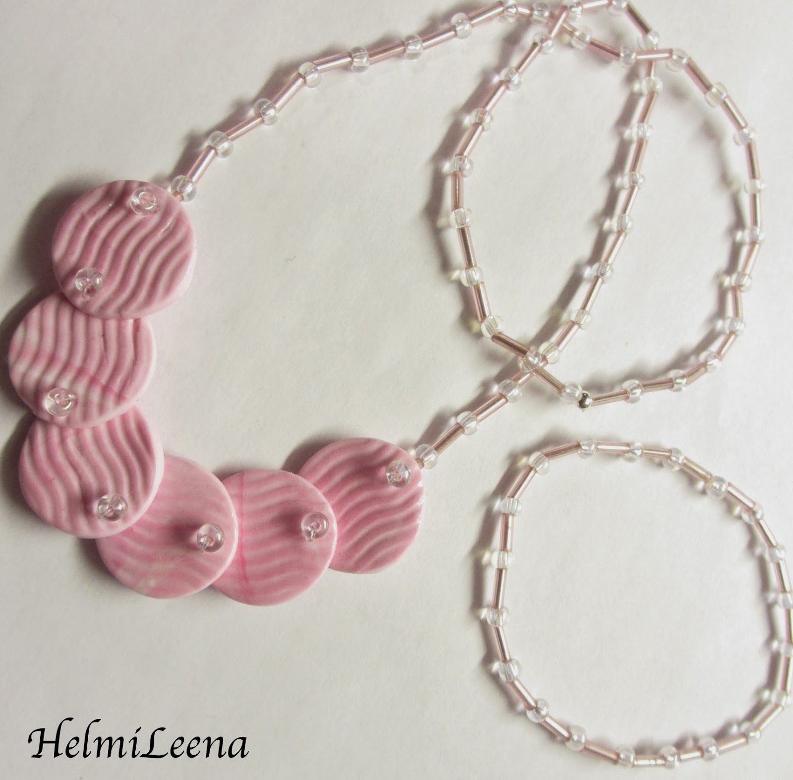 | PINK_WAVEPLATE_SET Joustolangassa siemenhelmiä (pyöreitä ja putki-mallisia), pinkkejä massahelmiä kolikon muodossa, pinta kuvoitu. |