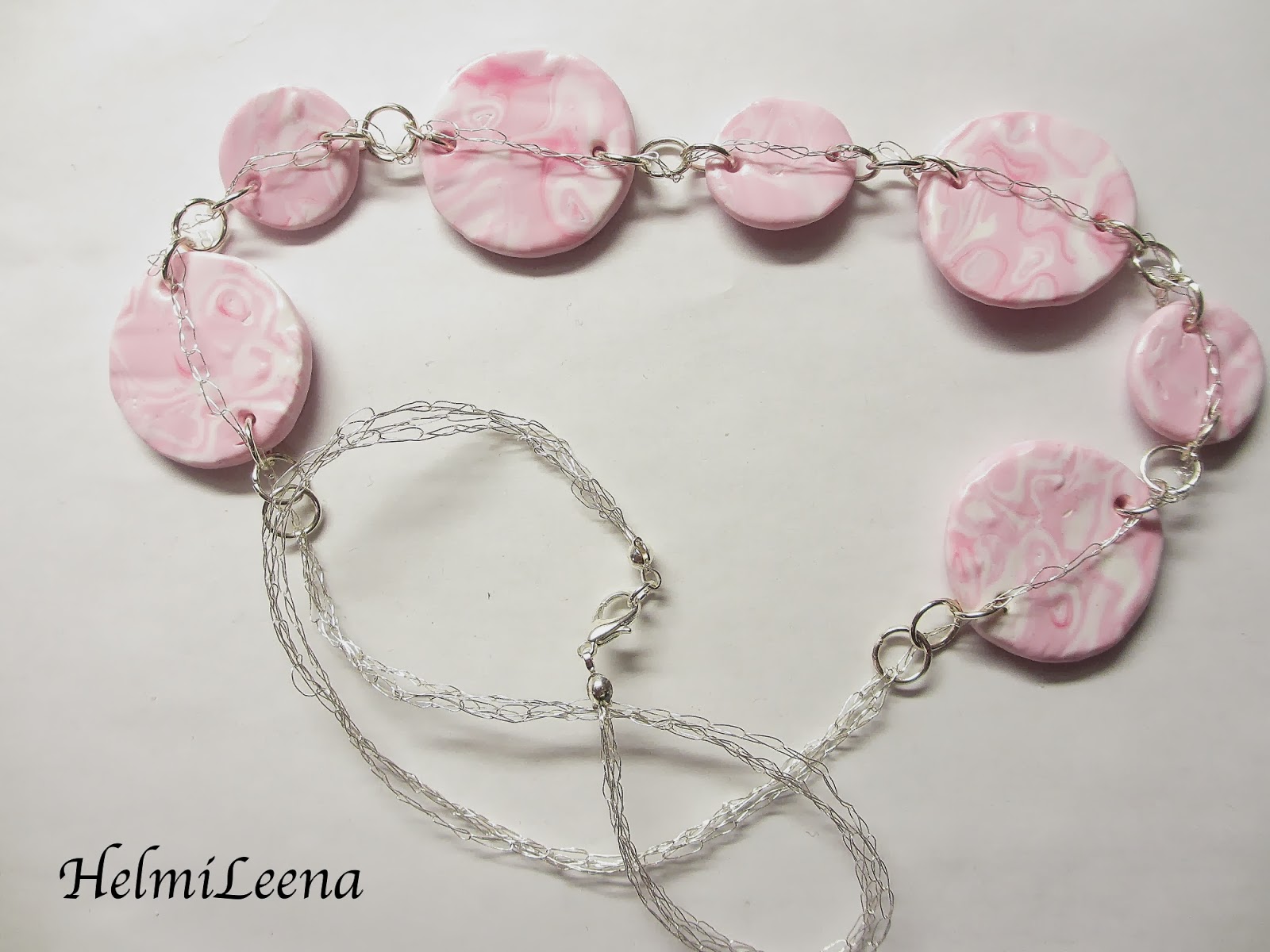 | NL_PINK_MOGUME Mogume gane-tekniikkalla kuvioitu kolikko-helmiä, virkattua hopeoitua lankaa. |