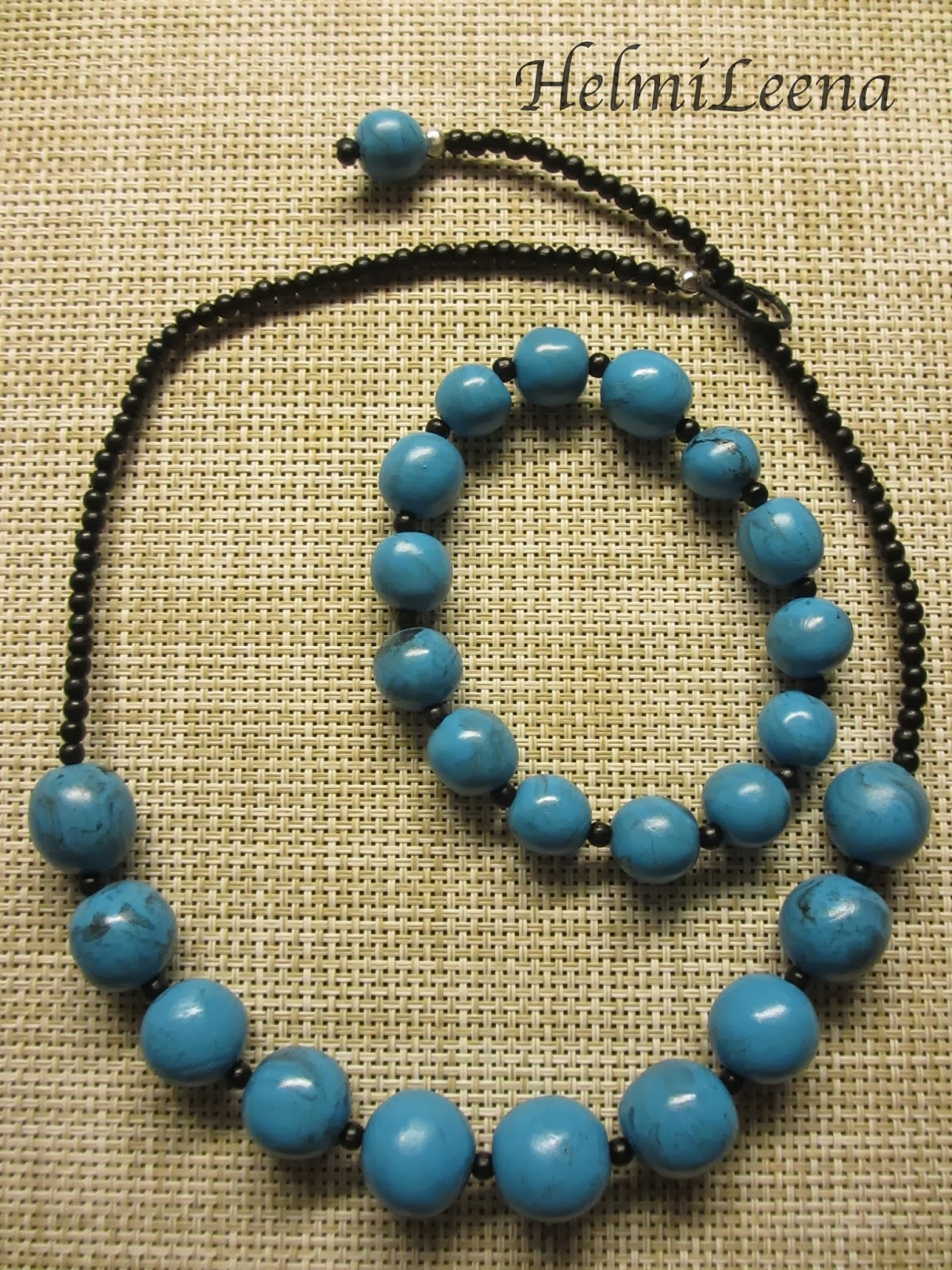 | NL_TURKOOSI Marmoroituja massahelmiä, mustia puuhelmiä. Kaulakoru puuvillanarussa, rannekoru joustolangassa. |